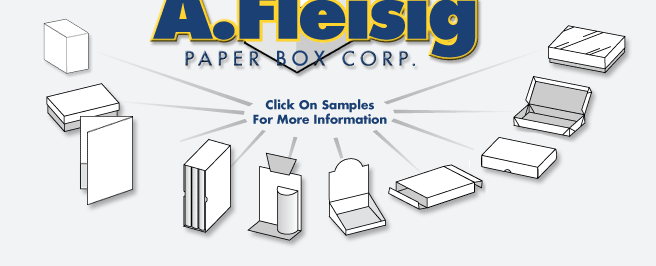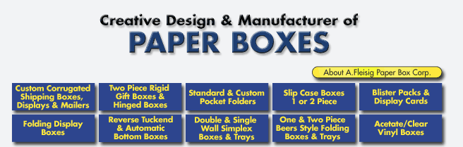 Custom Corrugated Shipping & Display Boxes & Mailers | Two-Piece Rigid Gift Boxes & Hinged Boxes | Standard & Custom Pocket Folders | Slip Case Boxes 1 or 2 Piece | Blister Packs & Display Cards | Folding Display Boxes | Reverse Tuckend & Automatic Bottom Boxes | Double & Single Wall Simplex Boxes & Trays | One & Two Piece Beers Style Folding Boxes & Trays | Acetate/Clear Vinyl Boxes | About A.Fleisig Paper Box Corp. |